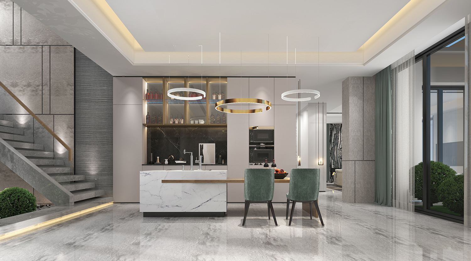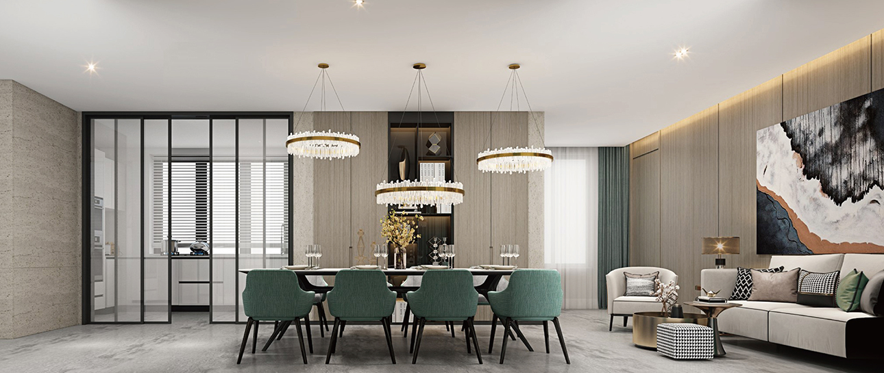 西厨吧台的设计,石材与原木的自由拼接,链接的不仅是肌理,更是空间。搭配艺术吊灯,让人浮想联翩。