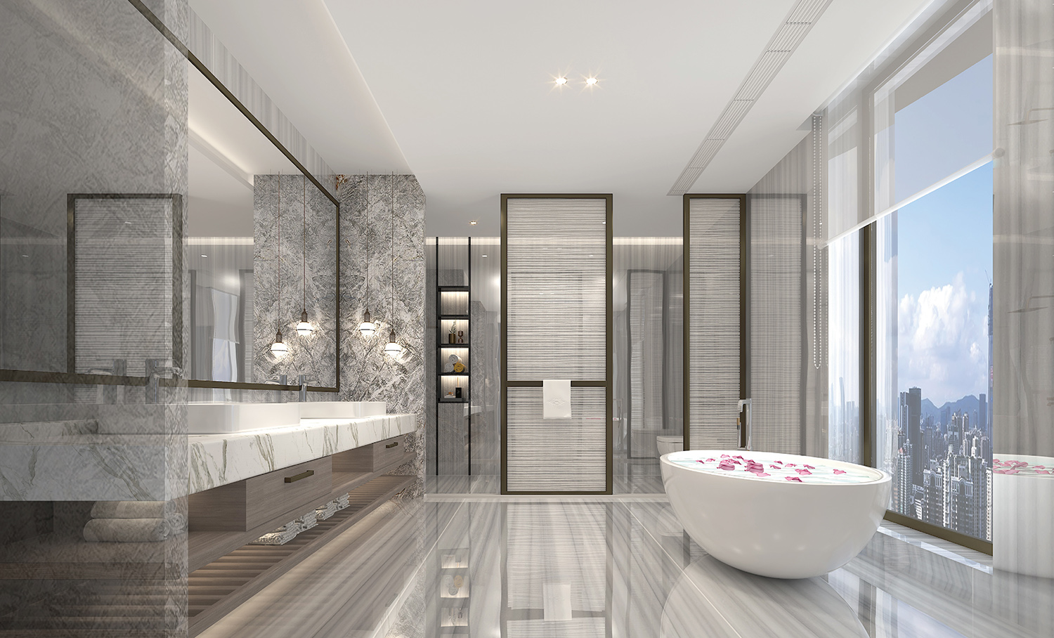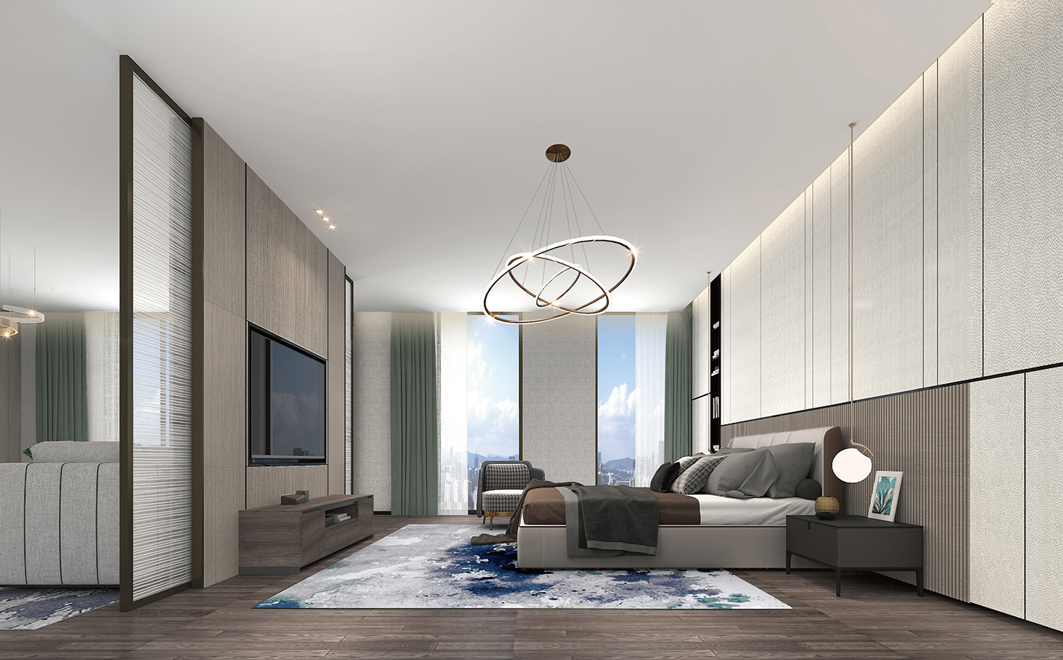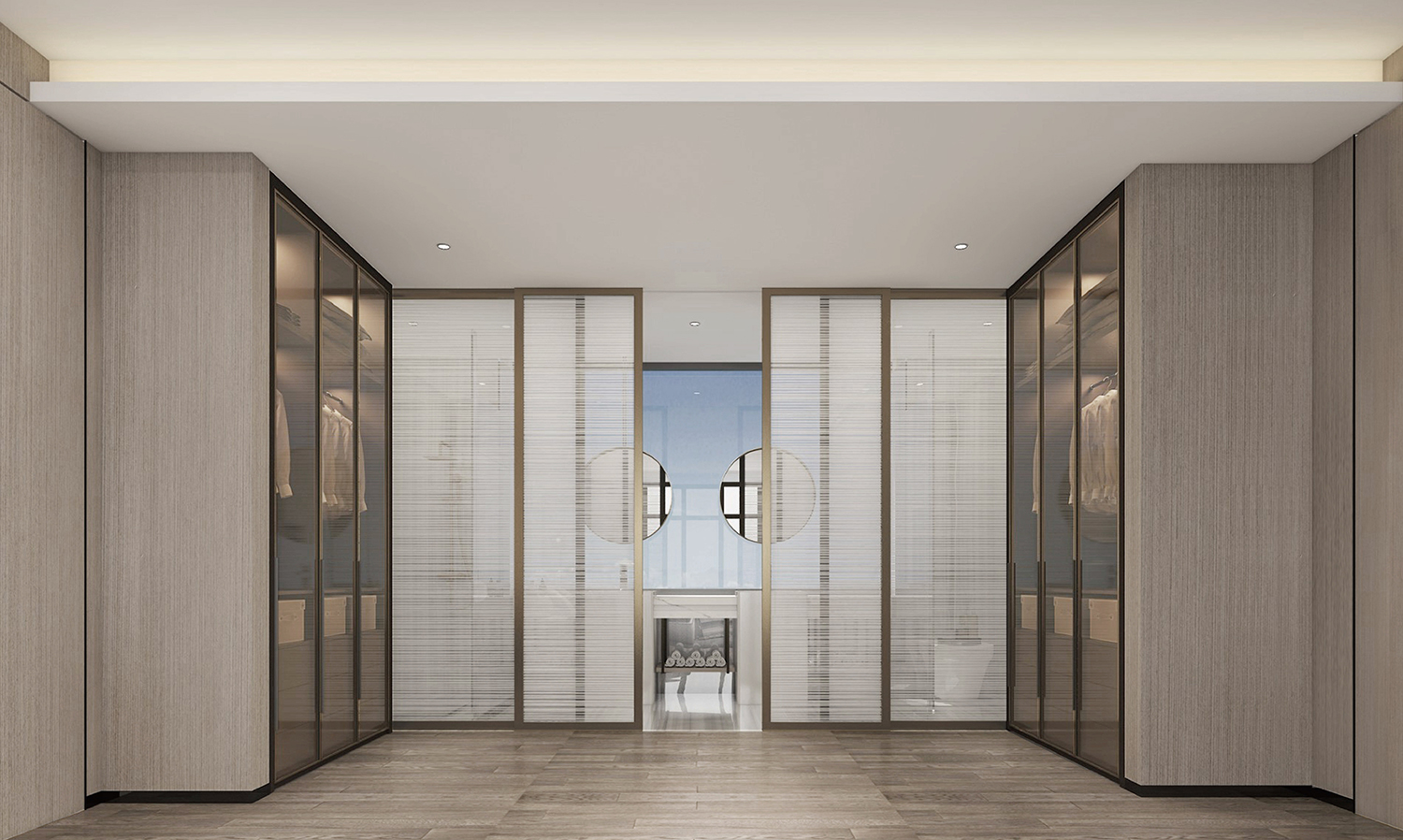 在阔绰的尺度里,要实现聚而不散,却又不乏合中有分,诚然这是对设计师谋篇布局的功力考核。利用空间框架的层叠与隐退关系,以自身独具的体量来划分层次,增添气场,辅以大块面材质顺畅的交织过渡,因势赋形,突显整体。