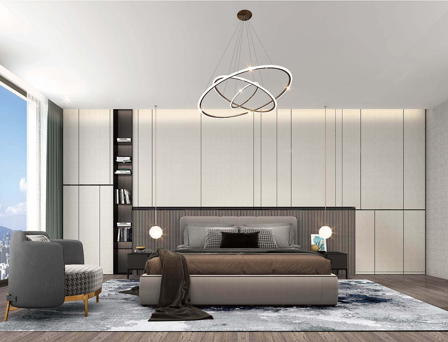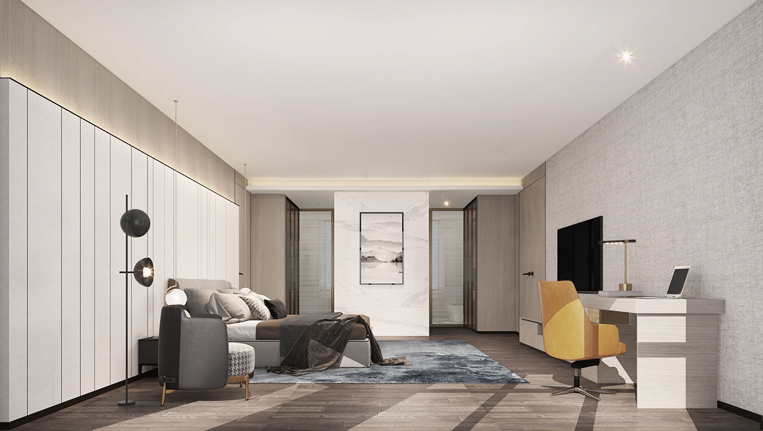 床头采用米白硬包拉缝的做法,营造自然编织的肌理感,搭配原木与灯光,触目所及之处皆臻品。恣意洒入的自然光影与质感十足的皮革交织在一起,淡淡的柔情,遇见洁白,那是一种源于生活的自然告白。